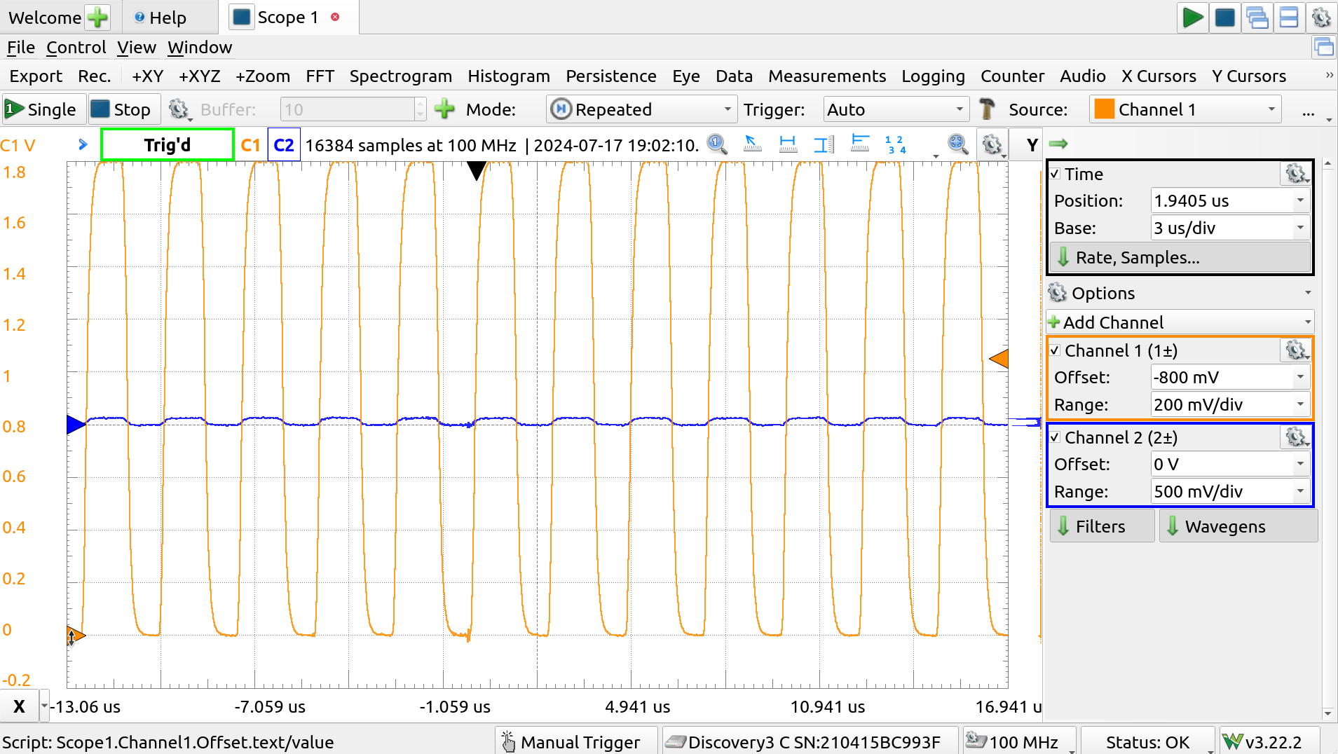 Doing everything manually–managing the device from the REPL on one hand and the instrument in another piece of software–works fine but for automating tasks and reproducible results, we can give control to the AD3, using the digital I/O.