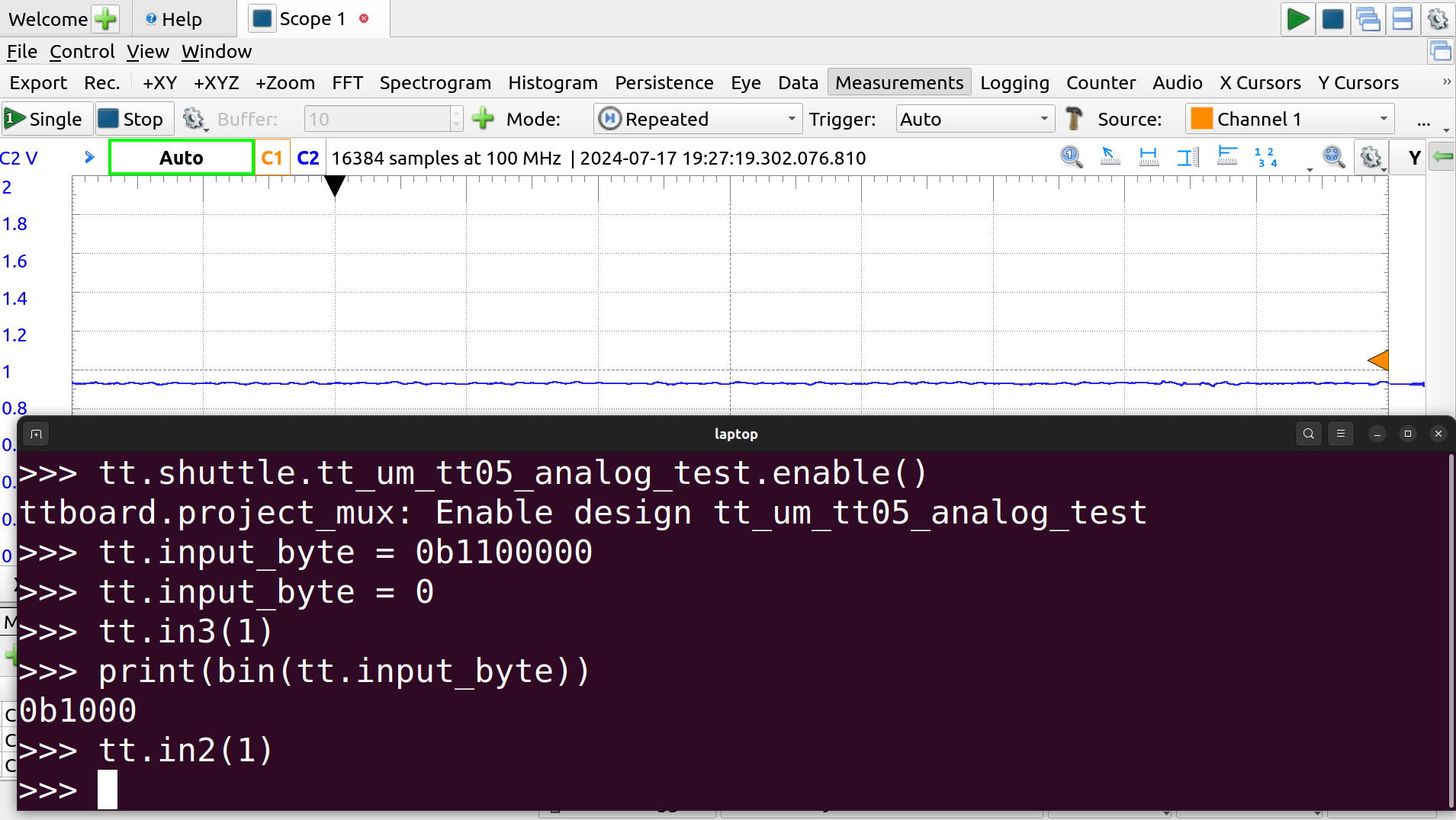 com.write("tt.mode = RPMode.ASIC_MANUAL_INPUTS\r\ntt.shuttle.tt_um_tt05_analog_test.enable()\r\n");